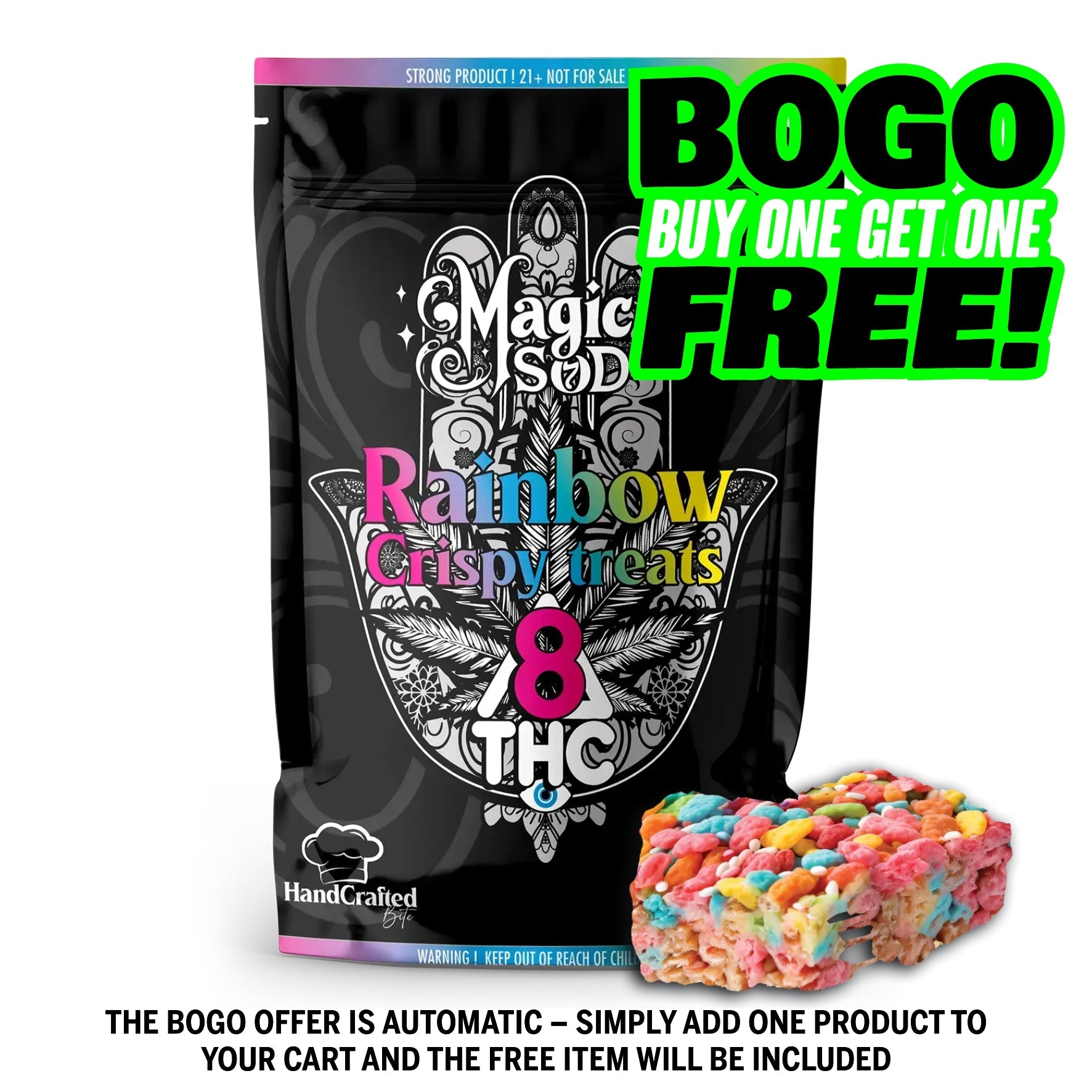 Add a little color to your day with Magic SOD’s Rainbow Crispy Treats infused with Delta 8 THC. These vibrant, crispy treats are packed with colorful layers of marshmallow and rice, offering a satisfying crunch and a sweet, indulgent flavor with the added benefits of Delta 8 THC. Perfect for those looking for “colorful THC snacks,” “crispy infused treats,” and “fun edibles,” these treats are a playful and delicious way to enjoy Delta 8 THC. Treat yourself to a colorful burst of flavor and a relaxing experience with every crispy bite! Order today and have these delivered straight to your doorstep. Your taste buds will thank you!